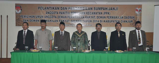 CIANJUR, (KC).- Sebanyak 160 anggota Pantia Pemilihan Kecamatan (PPK) se Kab. Cianjur, Jum'at (5/4/2013) dilantik oleh Ketua Komisi Pemilihan Umum (KPU) Cianjur Unang Margana di salah satu hotel di Cipanas. Hadir pada kegiatan tersebut Ketua DPRD Kab.Cianjur Gatot Subroto, Bupati Cianjur Tjetjep Muchtar Soleh, Kepala Badan Kesatuan Bangsa dan Politik (Kesbangpol) Tom Dani Gardiat, para pejabat KPU Cianjur dan tamu undangan lainya.