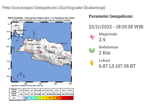 CIANJUR,[KC],- Cianjur kembali di guncang gempa, gempa tersebut bermagnitudo (M) 2,9 dan berpusat di darat, dilaporkan Badan Meteorologi, Klimatologi, dan Geofisika (BMKG) gempa terjadi pada Selasa (22/11/2022) pukul 18.39 WIB. Gempa terjadi pada kedalaman 2 kilometer.
